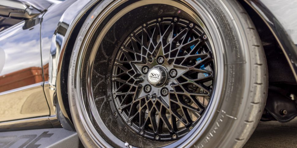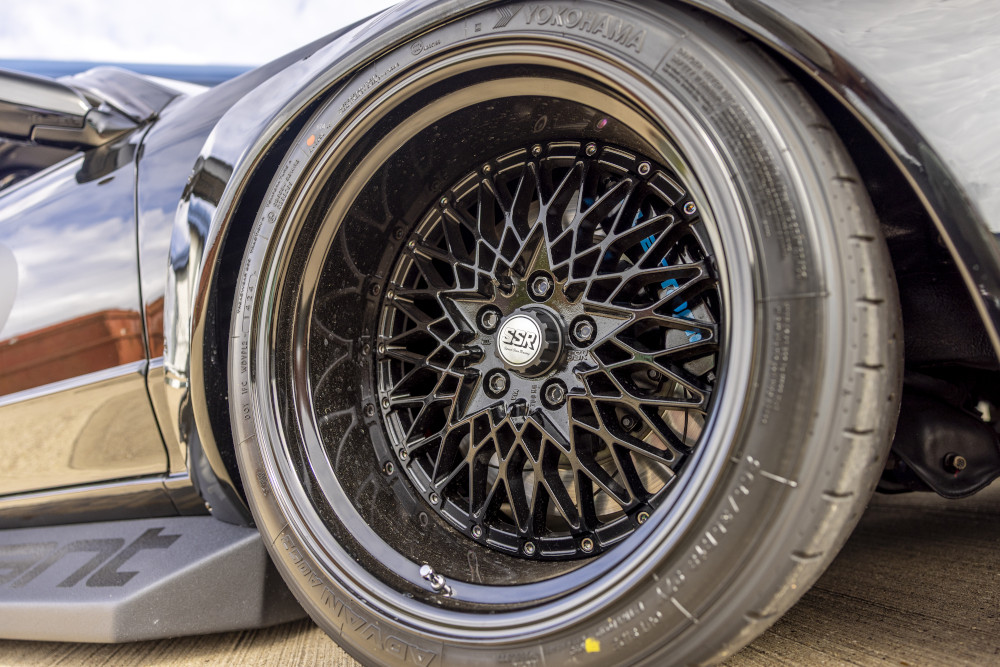 Wheel choice is gloriously era-correct: SSR Formula MESH three-piece (18x11J front, 18×12.5 rear) wrapped in Yokohama Advan A052 (265/35R18 front, 315/35R18 rear). It’s a deliberate nod to the golden age of Japanese tuning. “We wanted to replicate the Japanese demo car. SSR are a classic Japanese brand,” says the team.
