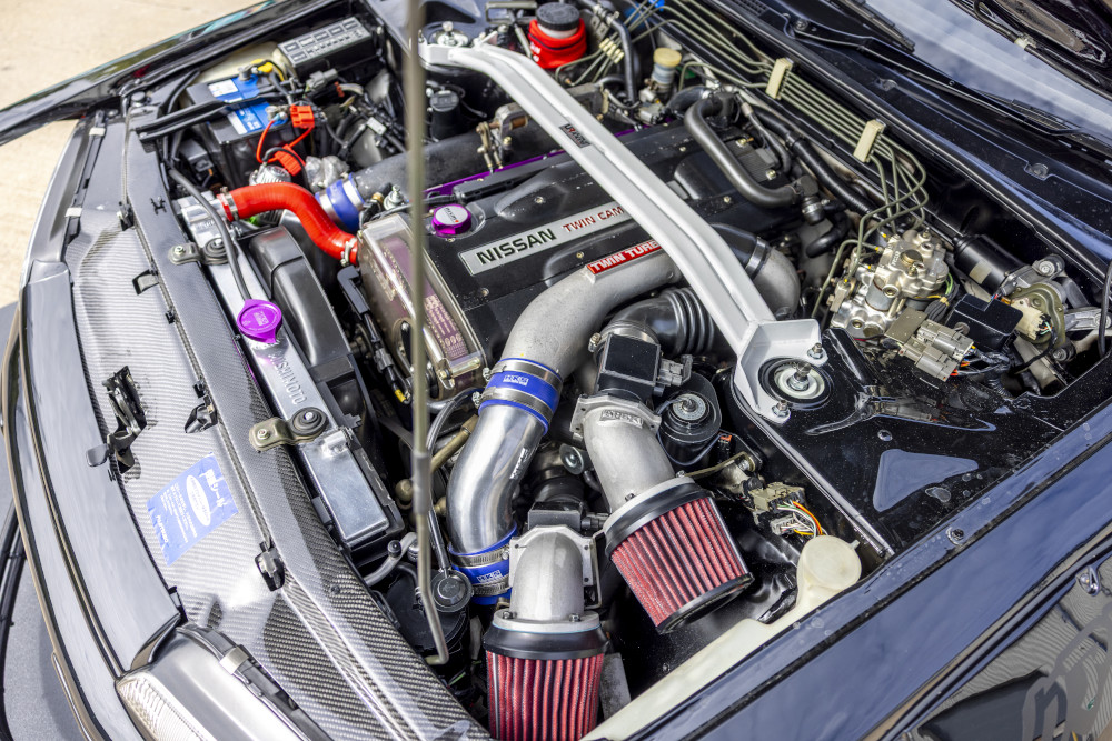 Under the bonnet, this RB26DETT is all killer, no filler. Think uprated HKS turbos, HKS race cams, HKS fuel rail/injectors, A’PEXi Power Intake, front-mount intercooler, Mishimoto radiator & oil cooler, Fujitsubo Legalis exhaust with decat, and a Link G4 ECU delivering launch control and anti-lag—mapped for a healthy 550bhp. It’s old-school turbo drama with modern reliability; tidy touches like a carbon slam panel and Ultra Racing brace keep the bay purposeful, not flashy.