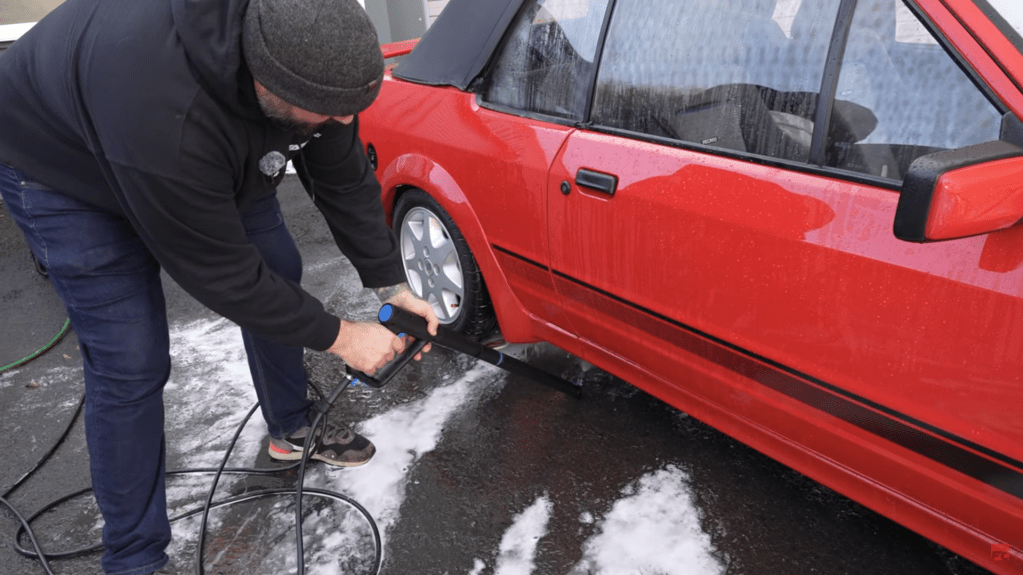 Because we were dealing with a soft-top Escort, we had to be gentle on the roof. That’s why we used a Nilfisk Excellent 160 pressure washer with a three-in-one nozzle, so we could quickly switch from a stronger jet on the lower sections to a softer fan on the roof and more delicate areas.